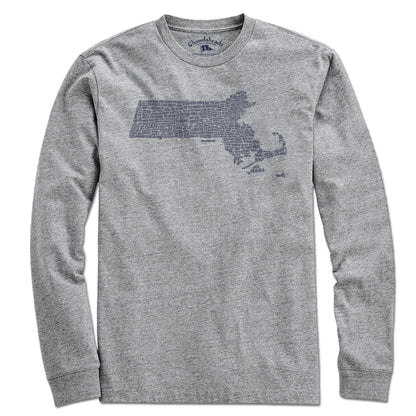 There are 351 cities and towns in Massachusetts, and they're all on this tee! AND, they're in the right(ish) spot. So now when someone hears your accent and asks "where ya from?", you can just point!