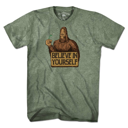 Believe in yourself! Do you believe in Bigfoot? Well, now you can tell the world with this fun and funky t-shirt. With a cool and relaxed fit, it's ideal for showing your support for Sasquatch. So whether you're jetting off to a sunny beach destination or just taking a relaxing weekend trip, be sure to bring along our believe in yourself sasquatch T-shirt.