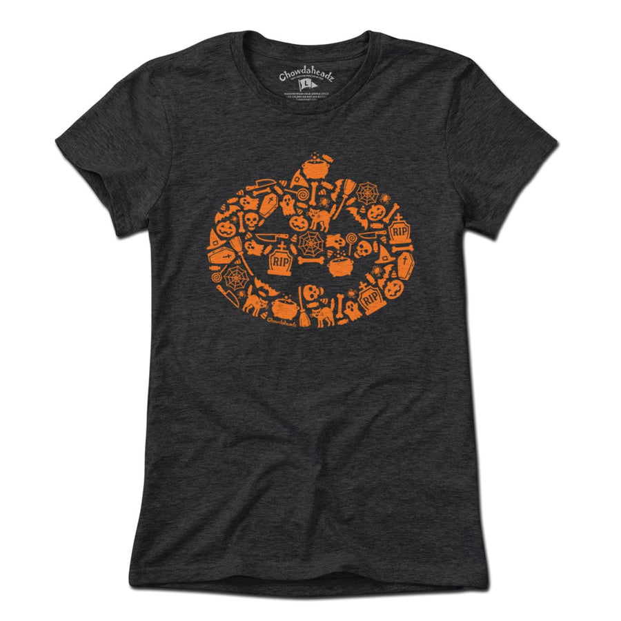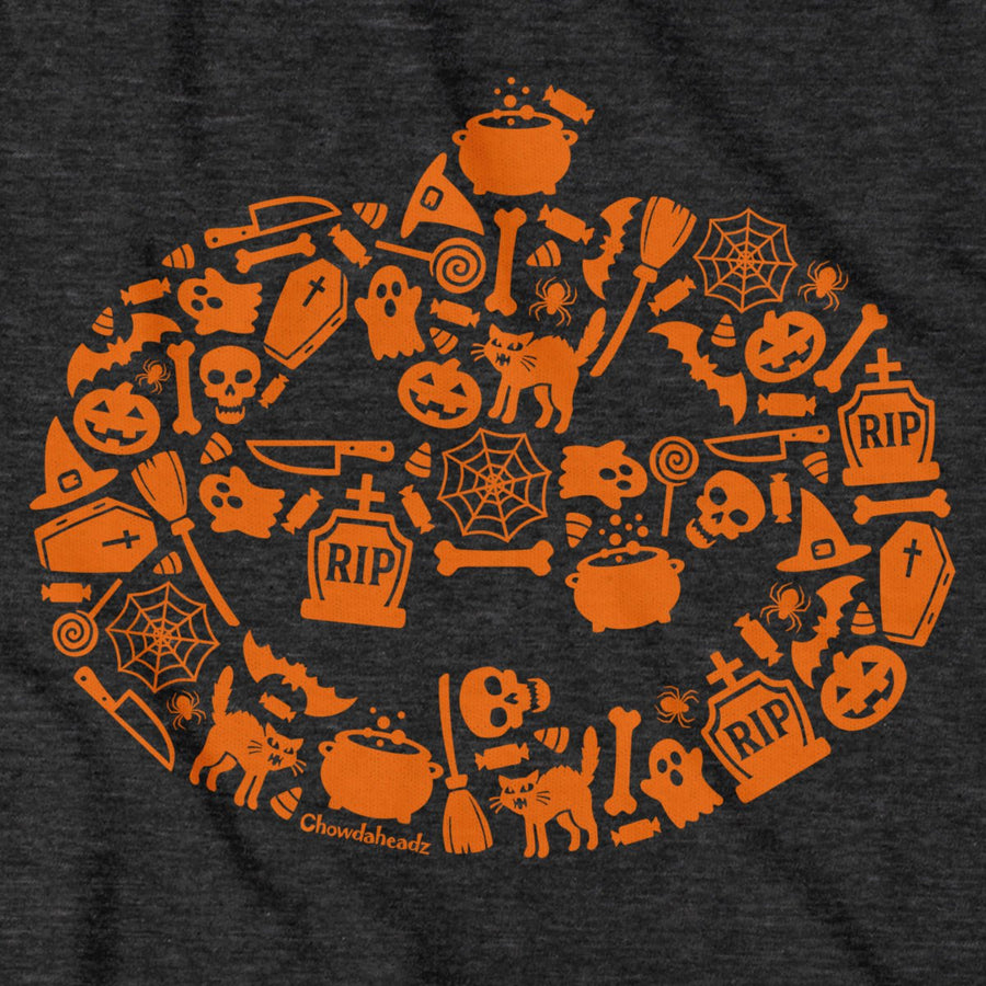 It's spooky season, and if you can't decide what part of October and Halloween you like the most, now you don't have to choose. This goofy grinning jack o' lantern is made up of all the things that make Halloween spooky and fun. Head out trick or treating with this tee decked out in pumpkins, skulls, ghosts, black cats, witch hats, and don't forget the candy. A spooktacular addition to your October attire. A must-have for any Halloween fan.