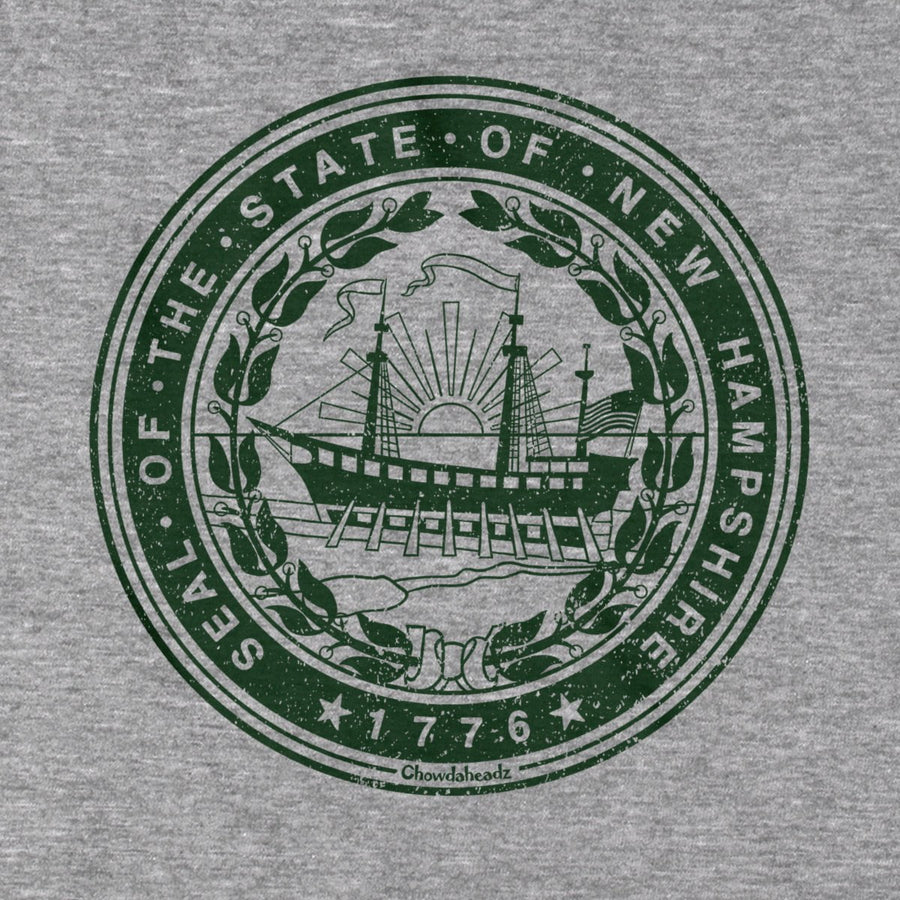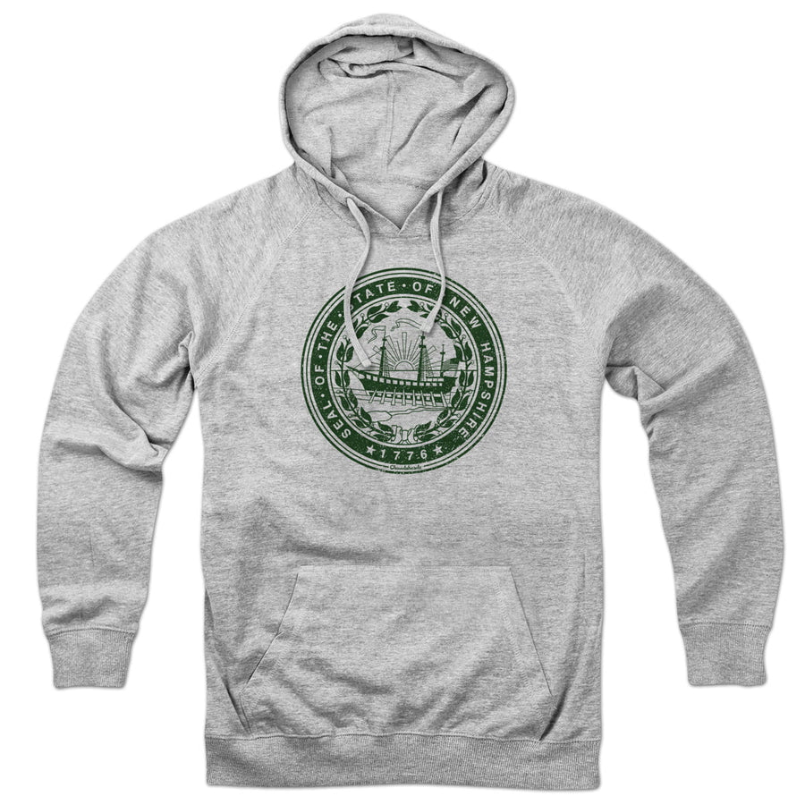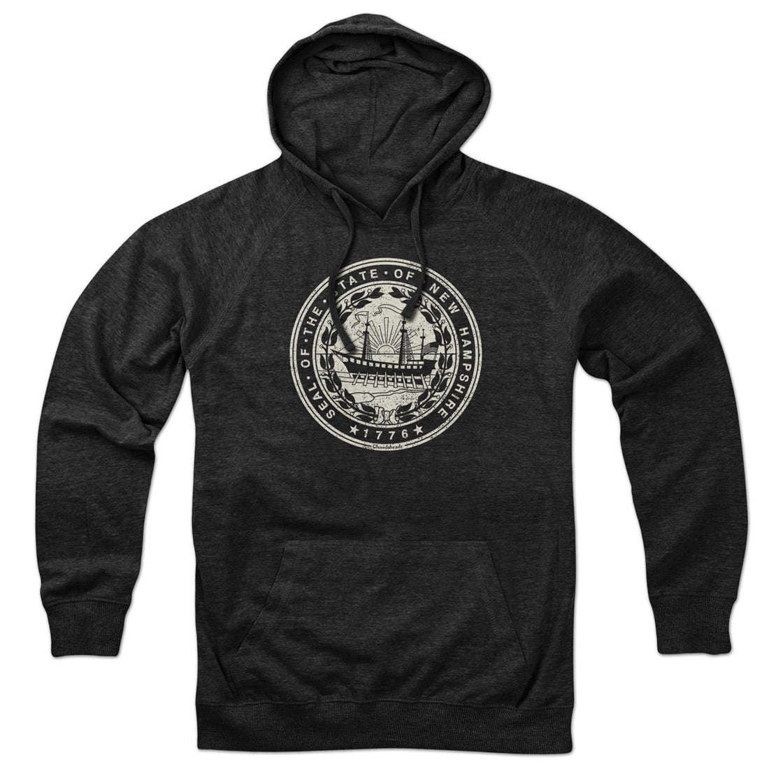 A familiar sight to most Granite Staters, rock New Hampshire's Great Seal with this design. New Hampshire has had 2 seals since it declared independence from Great Britain in 1776, but most people are familiar with this one. And let's be honest, this is the better seal. That old one just had a fish and pine tree on either side of a bundle of five arrows. ZZZZ. Back to the drawing board, New Hampshire. This one's got a cool boat, a nice sunset, and some fancy leaves all around it. Much more interesting. Maybe that's why it's lasted almost 250 years. Grab this hoodie and give a little history lesson to anyone who asks.