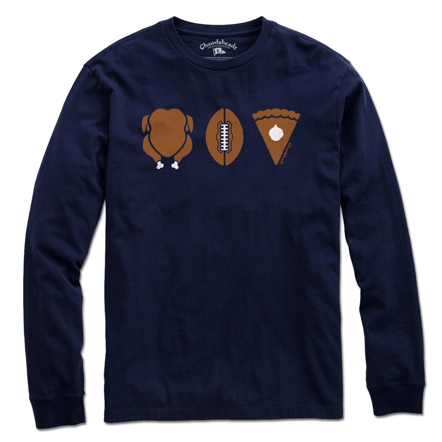 The reason for the season. The trifecta of Turkey Day. They're why you put up with the hassle of traveling, and cooking, and enduring conversation with family members you barely know every Thanksgiving. That magical Thursday at the end of November wouldn't be the same without any of them. Sure, family and friends and good health are okay reasons to be thankful, but we're talking about the big three: Turkey, Football, and Pie. Complete your Thanksgiving wardrobe with this tee. Sure to be a hit with everyone around the dinner table.