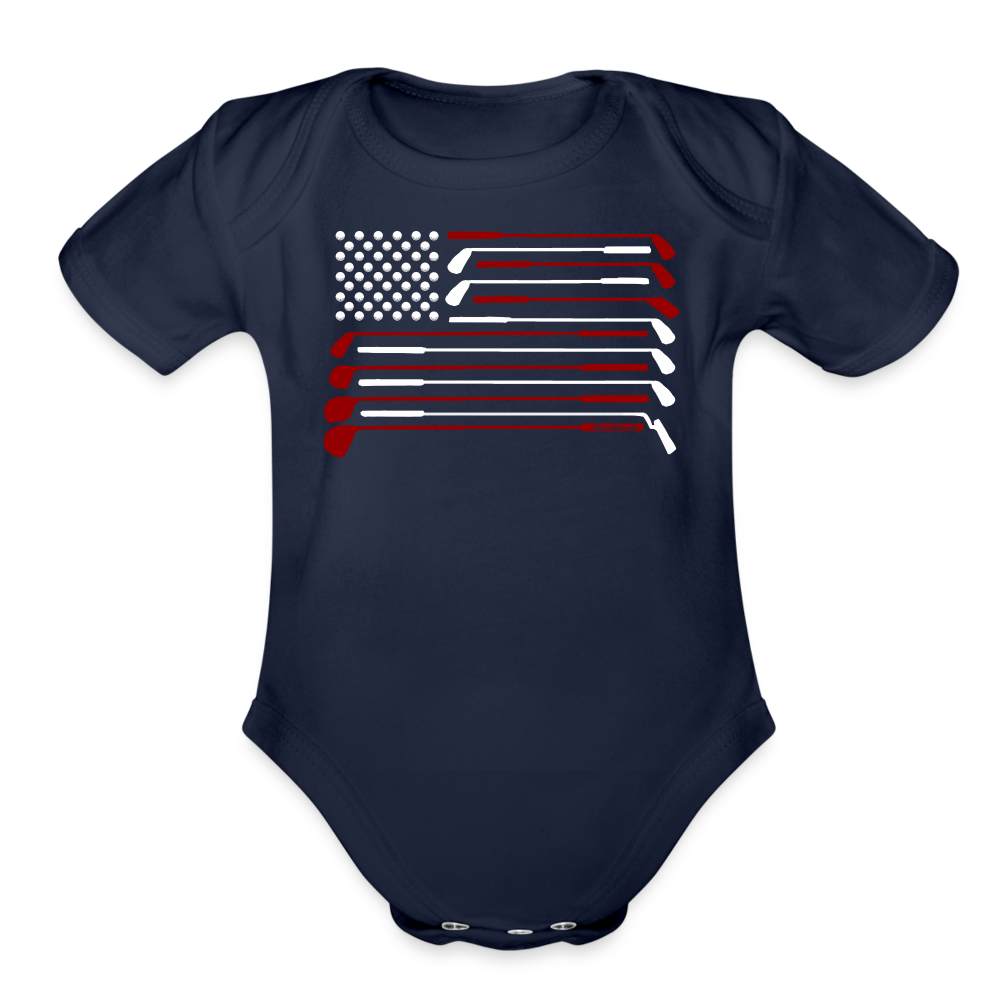 Do you have a patriotic baby who enjoys watching the game of golf with the rest of the family? Then this onesie is just for them! Now they can enjoy watching all the games in their very own red white and blue golfer flag onesie.