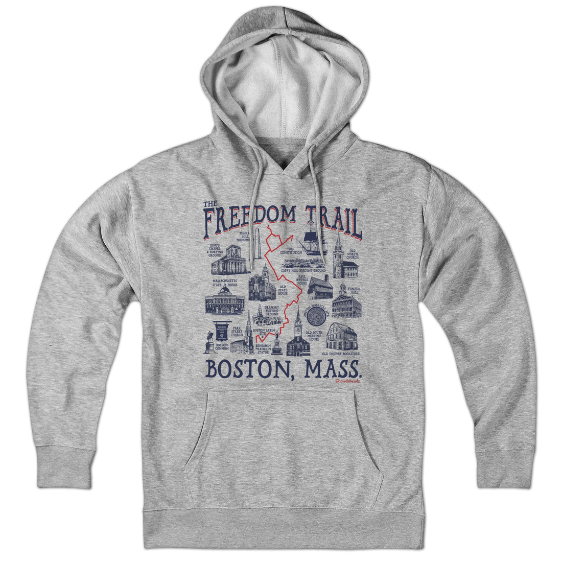 From Boston Common all the way to the Bunker Hill Monument, The Freedom Trail in Boston is 2.5 miles of history. This design shows the route and all 16 stops along this historical trail, conceived by Boston journalist William Schofield in 1951. By 1953, the trail had 40,000 people walking it annually. Celebrate that trip through history with this hoodie.