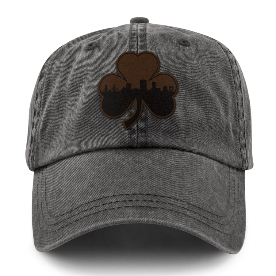 Boston Shamrock Skyline Leather Patch Washed Dad Hat