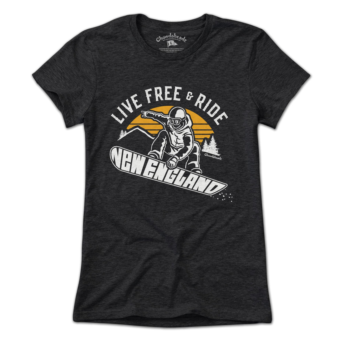 There's no shortage of great slopes in New England. So grab your board, head to your favorite, and Live Free & Ride. The perfect tee for the downhill enthusiast who wouldn't be caught dead on skis.