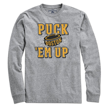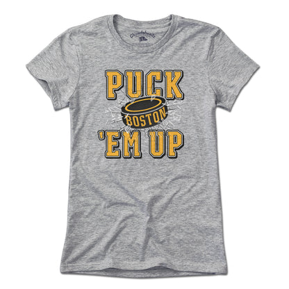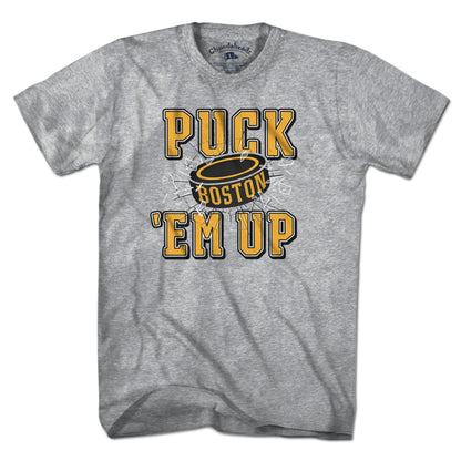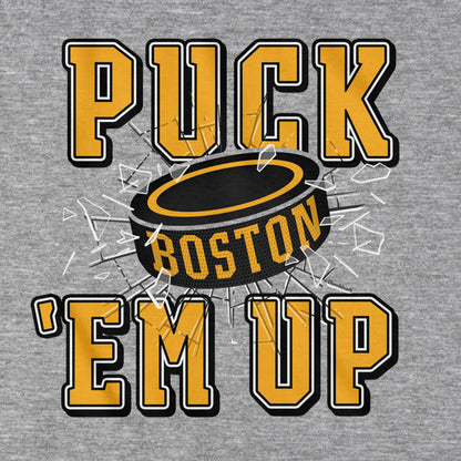 Boston is headed into another round and this tee is perfect for the in-your-face hockey fan. Nothing left to do but head onto the ice and Puck 'Em Up. Grab this tee before you head down to the Gahden and cheer on our hometown heroes. Let's Go Boston!