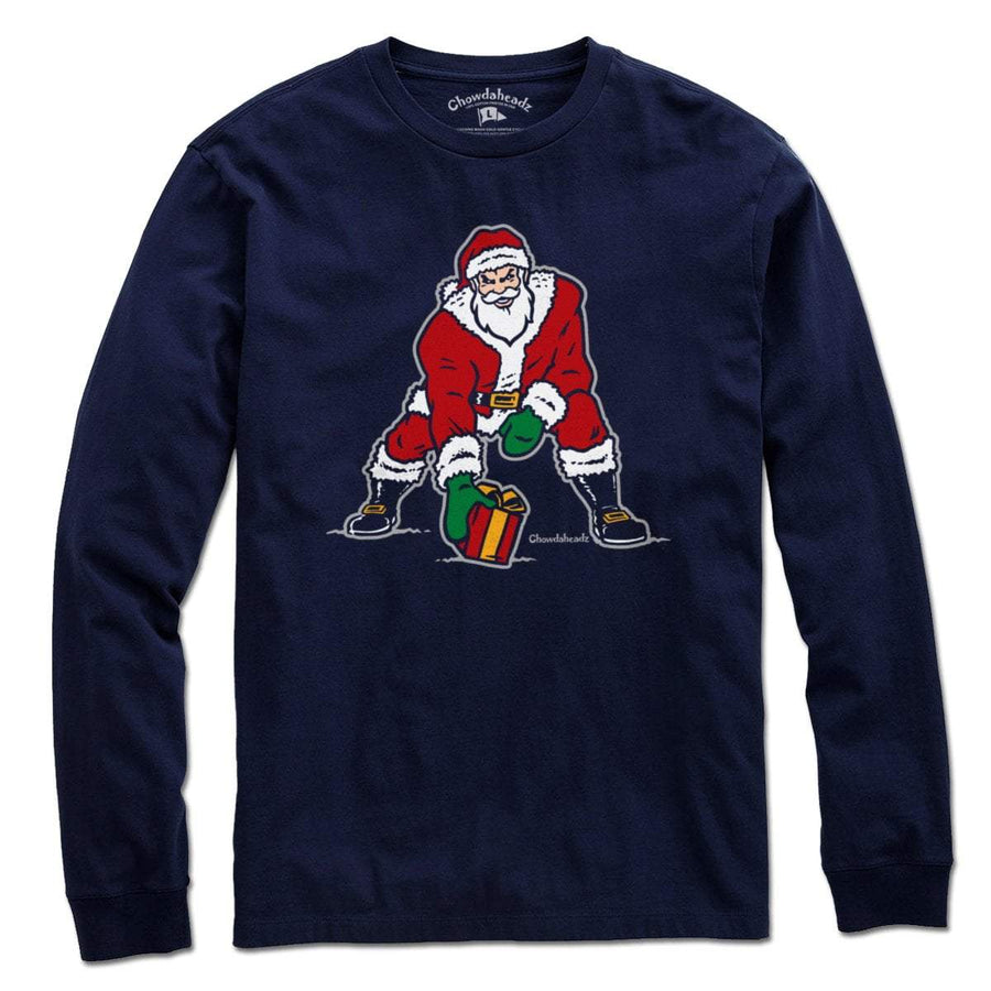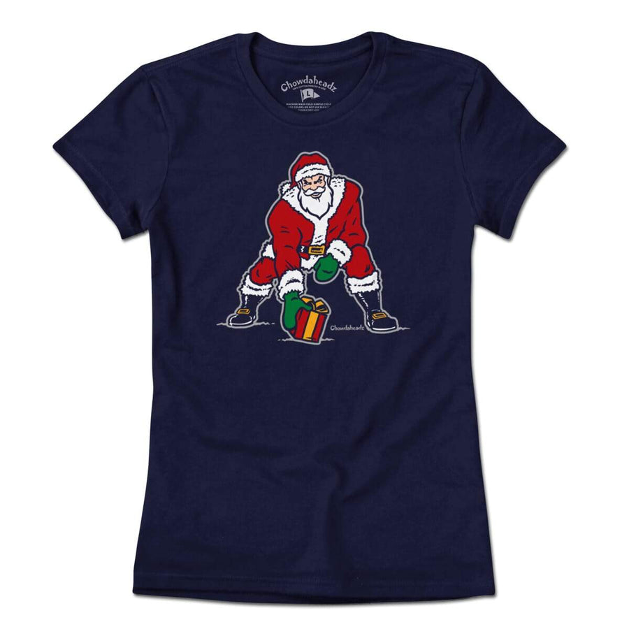 The holidays are here, and Santa is ready! He's been training all off-season for this, and he's waiting in his three point stance. This year, don't be surprised if your gift is thrown through your front window in a perfect spiral landing right under your tree. A must-have holiday shirt for the New England fan.