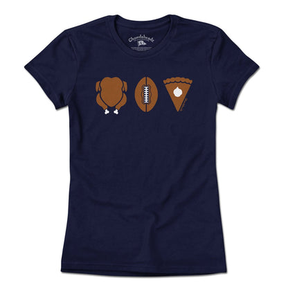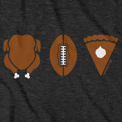 The reason for the season. The trifecta of Turkey Day. They're why you put up with the hassle of traveling, and cooking, and enduring conversation with family members you barely know every Thanksgiving. That magical Thursday at the end of November wouldn't be the same without any of them. Sure, family and friends and good health are okay reasons to be thankful, but we're talking about the big three: Turkey, Football, and Pie. Complete your Thanksgiving wardrobe with this tee. Sure to be a hit with everyone around the dinner table.