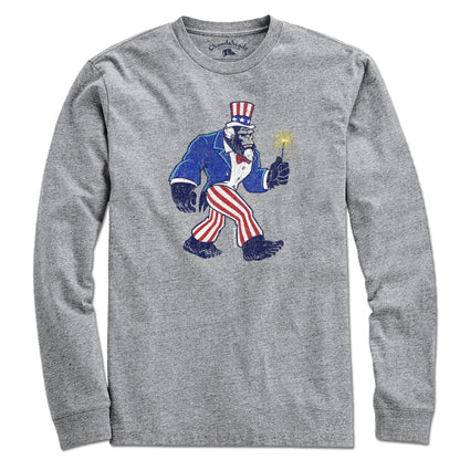 It's elusive, but this mythical creature has been spotted in the vicinity of cookouts and other celebrations, usually in early July. He's attracted to the sound of fireworks, the smell of grills, and anything red white & blue. This July 4th, keep your eyes on the tree line and you might catch a quick glimpse of a red, white, and blue blur, or see a sparkler going deep in the forest. It's Uncle Samsquatch, the most patriotic of all the cryptids. The perfect tee for celebrating your independence in style.